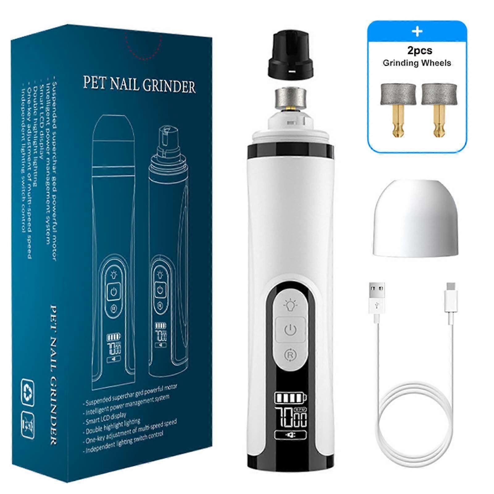 Features 1.2 LED lights, quickly and easily check the pet's blood line. 2.3 types of armor grinding ports, suitable for pets of different body sizes. 3. Three speeds, up to 9000RPM/minute, to improve the efficiency of pet paw grinding. 4. LCD advanced display LCD panel, real-time display of RPM and remaining battery level. The 5.2000mAh large capacity built-in battery can be used for 8 hours on a full charge. 6. USB charging cable, which can be connected to laptops, AC adapters, or portable power banks for convenient charging. 7. Ultra low noise keeps pets calm and helps polish their paws faster and easier. Specification Product Name: Digital Display Screen LED Dual Light Pet Nail Grinder Shell material: ABS Lighting fixtures: LED dual lights Gear: 3rd gear Speed: First gear 7000rpm, second gear 8000rpm, third gear 9000rpm Built in battery capacity: 2000mAh Charging time: 4.5 hours Usage time: 8 hours Charging method: dual-purpose charging and plugging Product size: 3.5 * 3.5 * 15.9cm, 190g Grinding head: 8g/piece Package Include: Armor grinder x1 Grinding head x2 Charging cable x1 English manual x1
