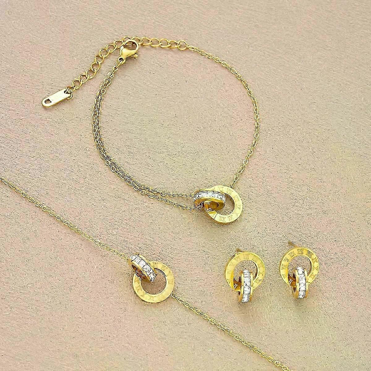 18K Gold Plated Roman Numbers Necklace Bracelet Earring Suitable for Women Fashion Crystal Cute Simple Interlocking Circles Jewelry Se