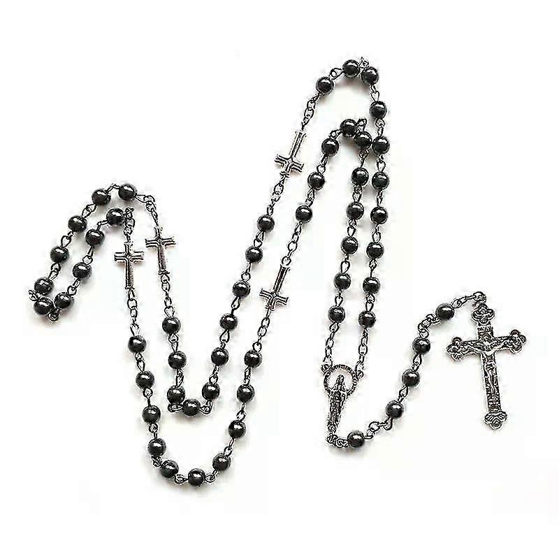 Vintage Hematite Rosary Catholic Long Jesus Cross Virgin Necklace Pendant Suitable for Men Women Religious Jewelry