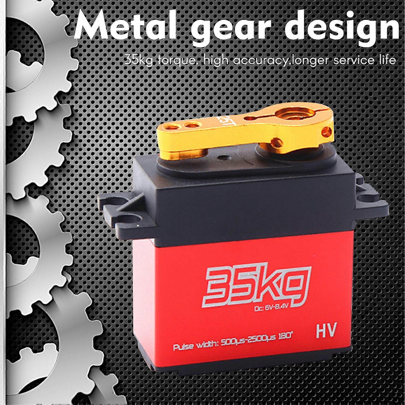 35KG Digital Servo Metal Gear Servo Waterproof for RC Cars Robot Manipulator with 25T Servo Arm Features: Good performance digital servo, suitable for RC car, robots. Precision gears, more wear-resistant, not easy to collapse and sweep teeth, etc. Including 35kg servo, servo accessories package, 25t metal servo arm. A great choice for university professors and students who are interested in developing software for robot parts. Tailored for RC hobbyists to provide different experiences and delight. Warranty: If there are any problems, please contact our store in time. We will give you a satisfactory solution. Specifications: Item: Digital Servo 35KG Servo 180 Degree: Number of Teeth: 25t Operating Voltage: 5 ~ 7.4 DC Volts Dead Brand: 2 μs     Weight: 60g Motor Type: Coreless Motor Gear Type:  Metal Working frequence: 50-333Hz Size:  40 *20 * 38.5mm Package information: Package Size: 4.5*2.5*4.5cm Package Weight: 65g Plastic Package Packing List: 1 *35kg Digital Servo 1* 25T Servo Arm 1* Some Fittings