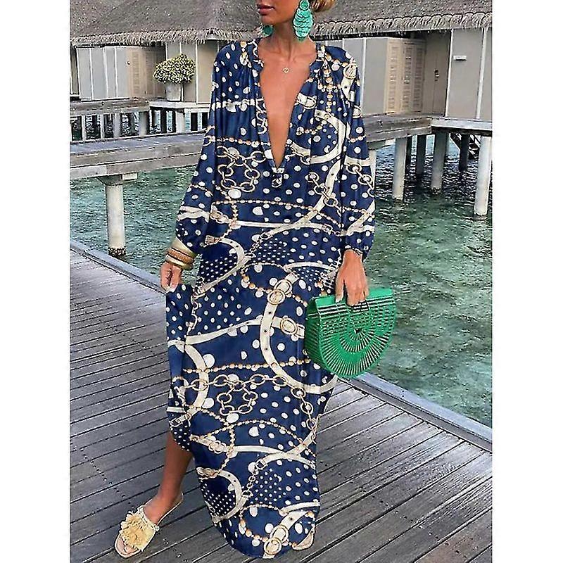 Luxora Women Vintage Maxi Dresses Summer Sexy Deep V-neck Long Sleeve Boho Print Long Dresses Female Beach Cover Up Elegant Robe