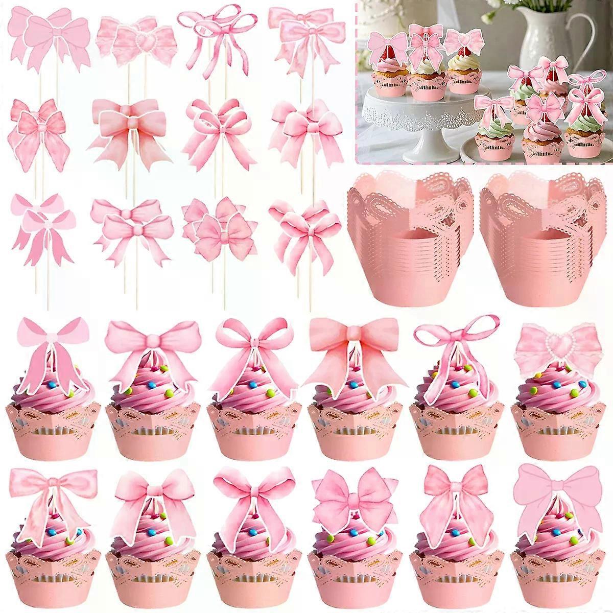 24/48Pcs Pink Cupcake Wrappers and Topper Ribbon Hollow Cupcake Liner Cute Bowknot Toppers Decor for Birthday Wedding Baby Party