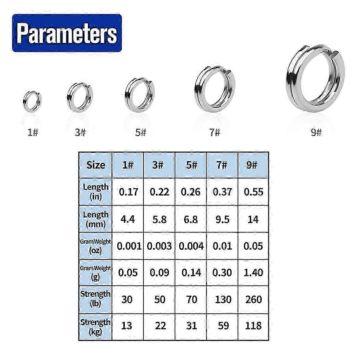 Our fishing split rings built for ocean fishing, Manufactured with stainless steel and given a nickel-plated finish, They prevent decay even in saltwater environment, ensuring long-term reliability. Each ring is made tough and sturdy processed with a high-strength flattening machine for ultimate durability. , maintaining its form and functionality even after fitting larger hooks. Designed for practical use,seamlessly and securely attach hooks, plugs, spinners, or other lures. Experience efficient lure switch within minutes without the need for line cuts or re-tying - making each fishing trip more enjoyable. Boost lure action while reducing wear and tear on your fishing line with our split rings. Perfect for enhancing artificial lure flexibility, it aids in enticing bigger fish. Come in 5 useful sizes allowing you to adapt to different fishing scenarios with assorted lures at hand. This promotes versatility and customization to meet unique fishing needs and preferences. Strong and durable Anti-rust Practical mixed size Easy to store and carry Size: 1#,3#,5#,7#,9# Diameter:0.17in/4.4mm~0.55in/14mm Tensile strength: 30Lb/13kg~260Lb/118kg 1#, Strength:30Lb/13kg, Split Ring Dia:0.17in/4.4mm, 100 counts 3#, Strength:50Lb/22kg, Split Ring Dia:0.22in/5.8mm, 100 counts 5#, Strength:70Lb/31kg, Split Ring Dia:0.26in/6.8mm, 100 counts 7#, Strength:130Lb/59kg, Split Ring Dia:0.37in/9.5mm,100 counts 9#, Strength:260Lb/118kg, Split Ring Dia:0.55in/14mm,100 counts Colour:Silver Material:Stainless steel Package Contents: 500 x Stainless Steel Fishing Split Rings Only the above package content, other products are not included. Note: Light reflection and different displays may cause the color of the item in the picture a little different from the real thing. The measurement allowed error is +/- 1-3cm.