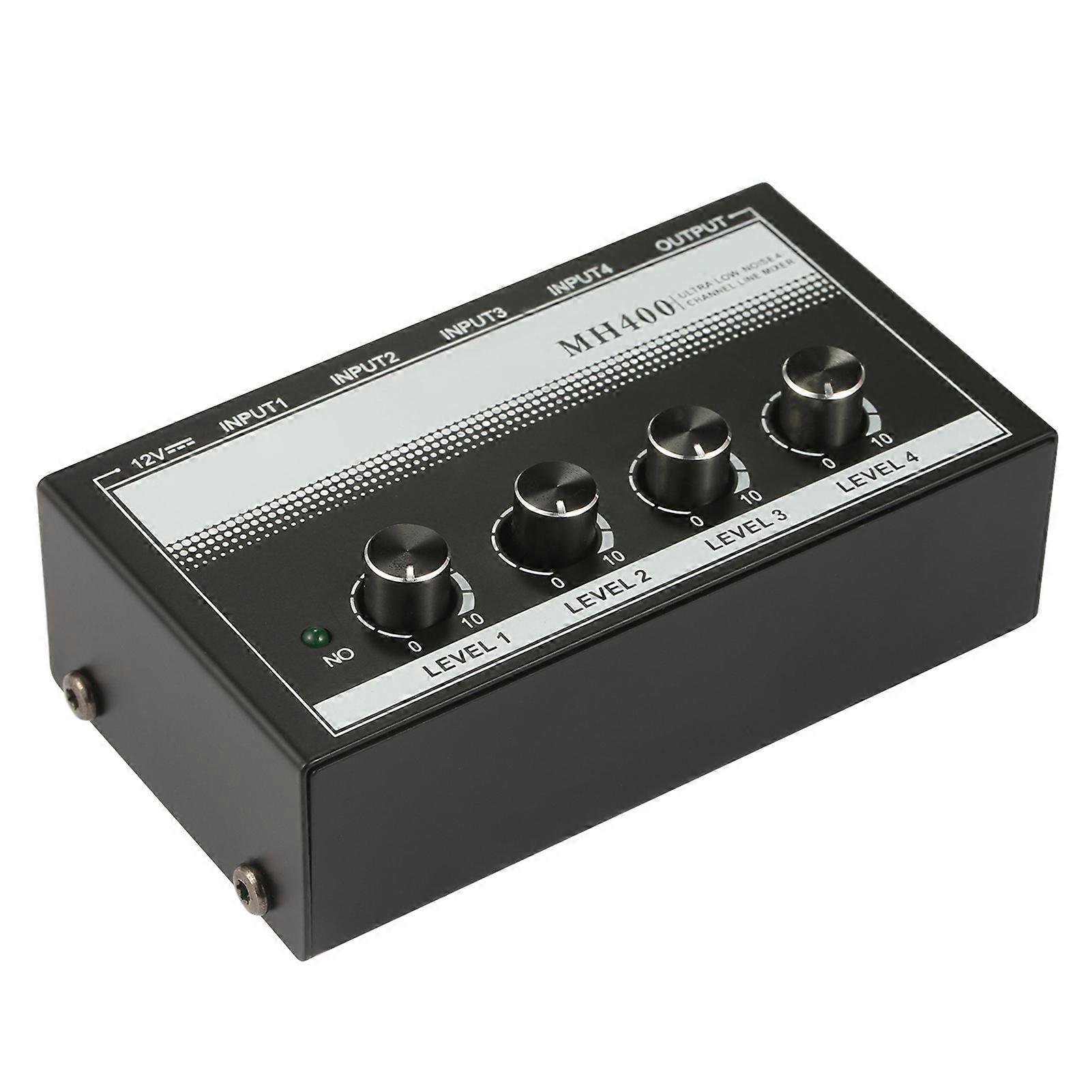 Mini Audio Mixer Portable 4 Channel Microphone Instrument Audio Mixer with Volume Adjustment Material: metal + electronic components Color: black Interface: 1/-inch TS connector Input Impedance: min. 4.7kΩ Max Input Level: +16 dBu Output Impedance: approx. 80Ω Max Output Level: +16 dBu Item Size: approx. 46.5*57.2*103.6mm / 1.83*2.25*4.07in Item Weight: 370g / 13.05oz Package Size: 14*9.5*7.5cm / 5.51*3.74*2.95in Package Weight: 305g / 10.75oz