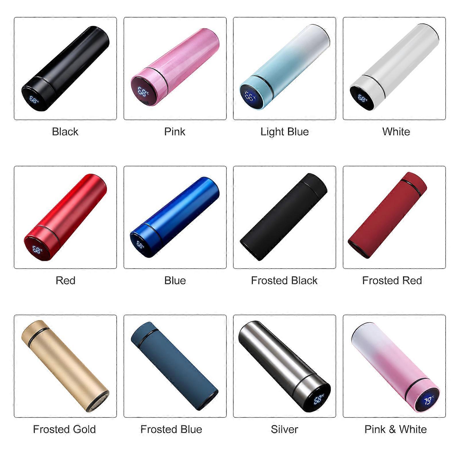 480ml Intelligent Temperature LED Display Vacuum Insulated Water Bottle Stainless Steel Leak Proof BPA Free Bottle for Hiking Travel Outdoor Gym Fitnes Description: This temperature display water bottle is made of high-quality stainless steel which BPA and toxic-free, enhancing the style, health, and fresh taste of your drinks. This stainless-steel water bottle is ideal for travel, beach, camping, outdoor sporting activities, Cycle, jogging, yoga, office, school, and much more.   Features: [Vacuum Insulated]This insulated water bottle is thoughtfully double-walled and vacuum insulated, keeps your favorite hot drinks HOT and cold drinks COLD for 24h. [LED Display]The smart water bottle has a waterproof LED display, waterproof, it's low energy consumption.   [Easy e]Press the top of the thermos softly, sensitive capacity touch-cover can show the temperature of the water inside the thermos immediately. [Leak-Proof]The cap design securely seal for travel and storage of water, milk, etc, prevents the bottle from accidentally opening. [Built-in Stainless Steel Filter]Fine holes for quick separation of tea bags and tea. Specifications: Color: White; Pink; Light Blue; Black;  Red; Blue; Frosted Black; Frosted Red; Frosted Gold; Frosted Blue; Silver; Pink & White (Optional) Capacity: 480ml Material: 304 Stainless Steel, PP Style: Modern Insulation time: 24H Application: Water, Drink Occasion: Kitchen, Hotel, Travel, Camping, Gym, etc Package Size: 24*7*7cm / 9.44*2.75*2.75inch Package Weight: 350g / 0.77lb Package List: 1 * Vacuum Insulated Water Bottle
