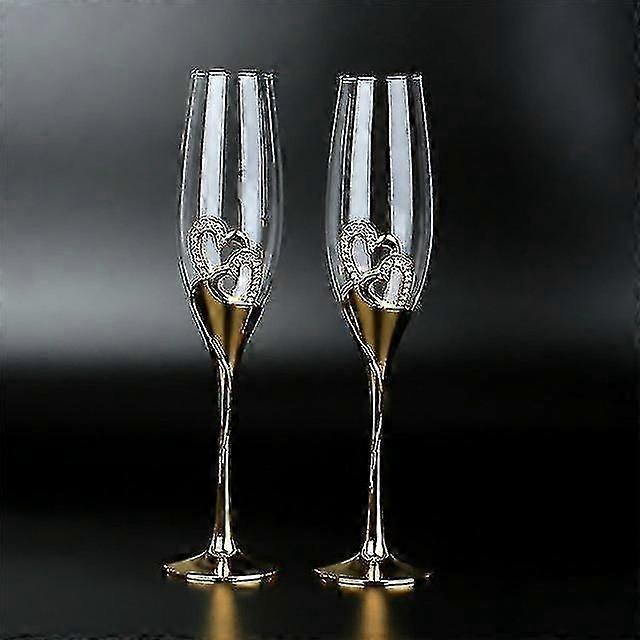 Set of Two Crystal Champagne Flutes with Gold Metal Stands for Weddings, Valentine's, and Parties