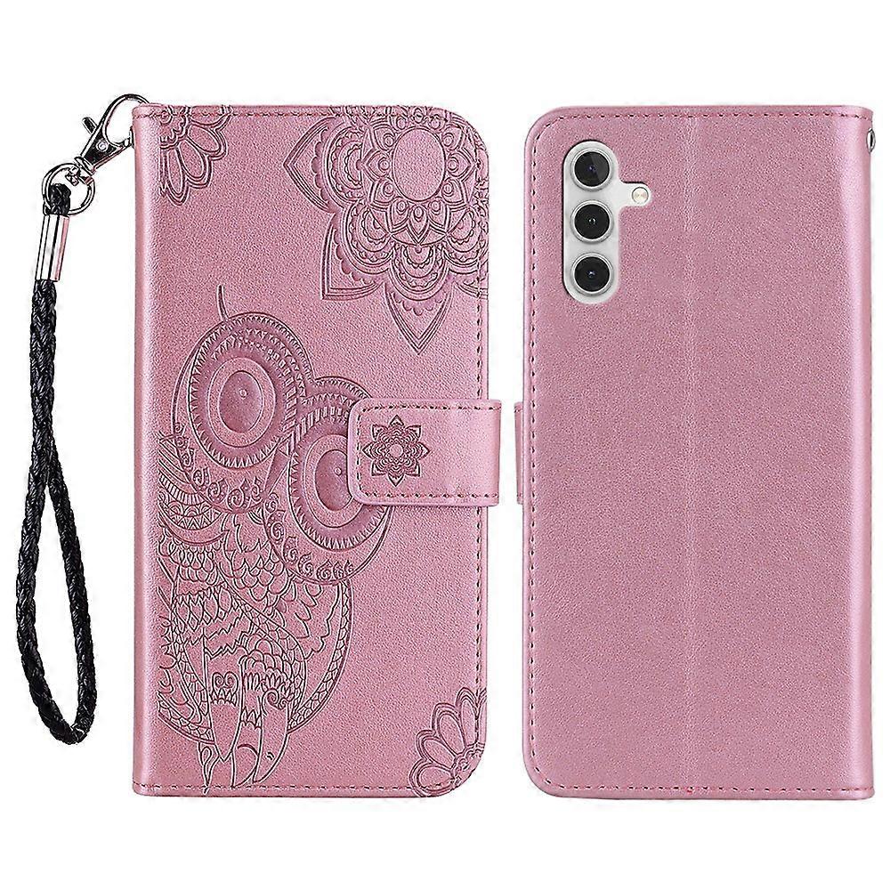 For Samsung Galaxy S25 FE Case Owl Flower Imprinted Leather Cover Wallet with Strap - Rose Gold
