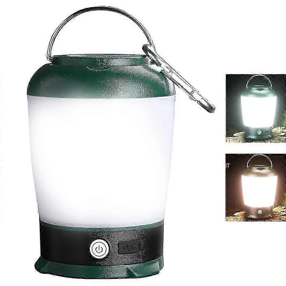 Power: 9Wand4W Light color: White light or Warm light Color: Green and Milky white Material: PCandABS Size: 90x74xH127 mm(3.54x2.91xH 5 in) Weight: 205g(0.45lb) Waterproof: IP44 18650 battery: built-in 2000mAh Charging port: Micro USB White light gear: weak white light-medium white light-strong white light Warm light position: warm weak light-warm medium light-warm strong light Features (1) White and warm two-color, white light three levels satisfy daily lighting, and warm light three levels are soft and not dazzling. (3) IP44 Waterproof,360 ring light, not letting go of every corner. (4) ABSandPC matte design, good texture, scratch-resistant. (5) The red indicator light is always on when charging the green indicator light is always on when it is full. (6) Diversified charging, easy to use: you can use chargers, power banks, computers and other equipment to charge the lamps. (7) The lighting function can be used while charging. (8) This lamp has a handle on the head and a matching carabiner, which is very convenient to carry and hang. How to use 1. Single press the switch button to turn on the white low light level, and continue to press the gear adjustment (white low light-white medium light-white strong light-off) to cycle. 2. Press and hold any position for about 2 seconds to turn on the warm and low light level, and continue to press to adjust the level (warm low light-warm medium light-warm strong light-off). 3. One-key shutdown of 5S fixed gear, gear adjustment needs to be completed within 5 seconds, and continue pressing for more than 5 seconds to turn off the light source