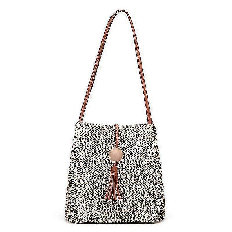 Women's Straw Shoulder Bag - Handcrafted Knitted Crossbody Bucket Bag with Tassel for Summer Diagonal Use