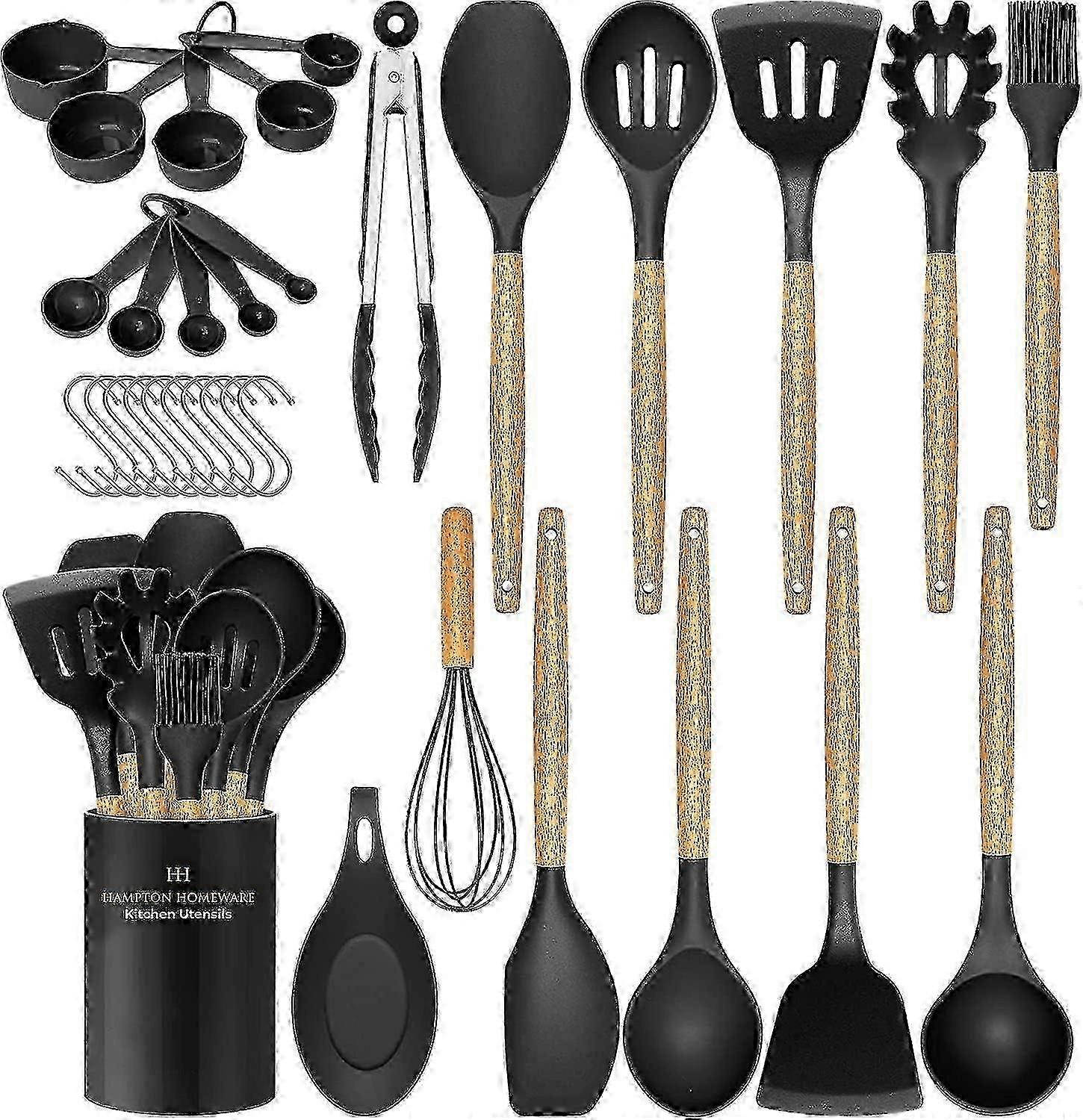 33 Piece Kitchen Utensils Set with Non-stick Heat-resistant Silicone Cooking Tools and Wooden Accessories for Cooking
