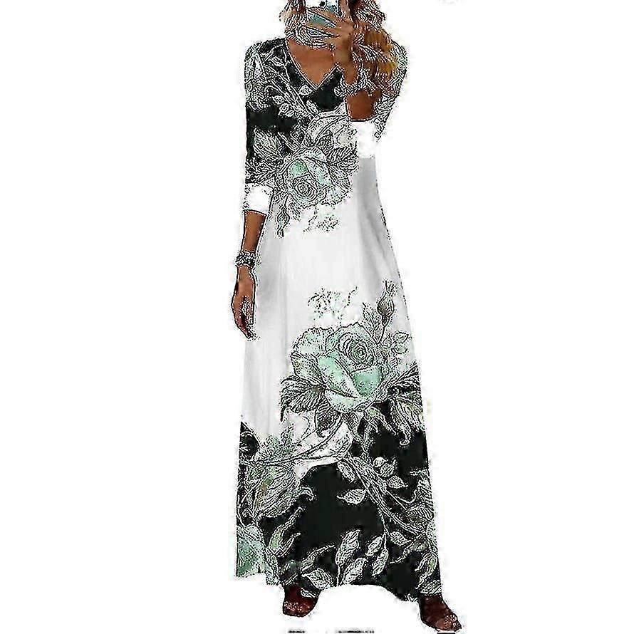 Women's Comfortable Girls' Dress with V-neck Button, Mid-length Long Sleeve Prints