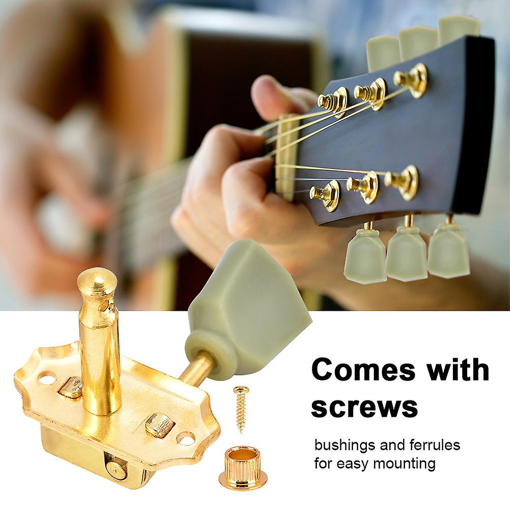 3L3R Guitar Tuning Pegs Tuners Zinc Alloy Machine Heads Instrument Accessory​ Description: This is a set of exquisite tuning pegs for guitar. If you want to find tunners, our products is your best choice. Comparing with open tuners, our tuners are more durable. Easy mounting, a set of tuning pegs comes with screws, bushings and ferrules.   Features: Half closed type tuners prevent the gear from being exposed to air and reduce the rust, which is more durable. Comes with screws, bushings and ferrules for easy mounting. The tuned guitar string does not loosen easily. With these tuning pegs, you can tune guitar strings fast and accurately. internal gear, it's effective to prevent screw slippage. Specifications: Condition: Item Type: Instrument Accessory Material: Zinc Alloy Body + Plastic Button + Steel Gear Colour: Gold + Jade Color Weight: Approx. 161g   Package Includes: 6 * Guitar Tuning Peg 6 * Ferrule 12 * Screw