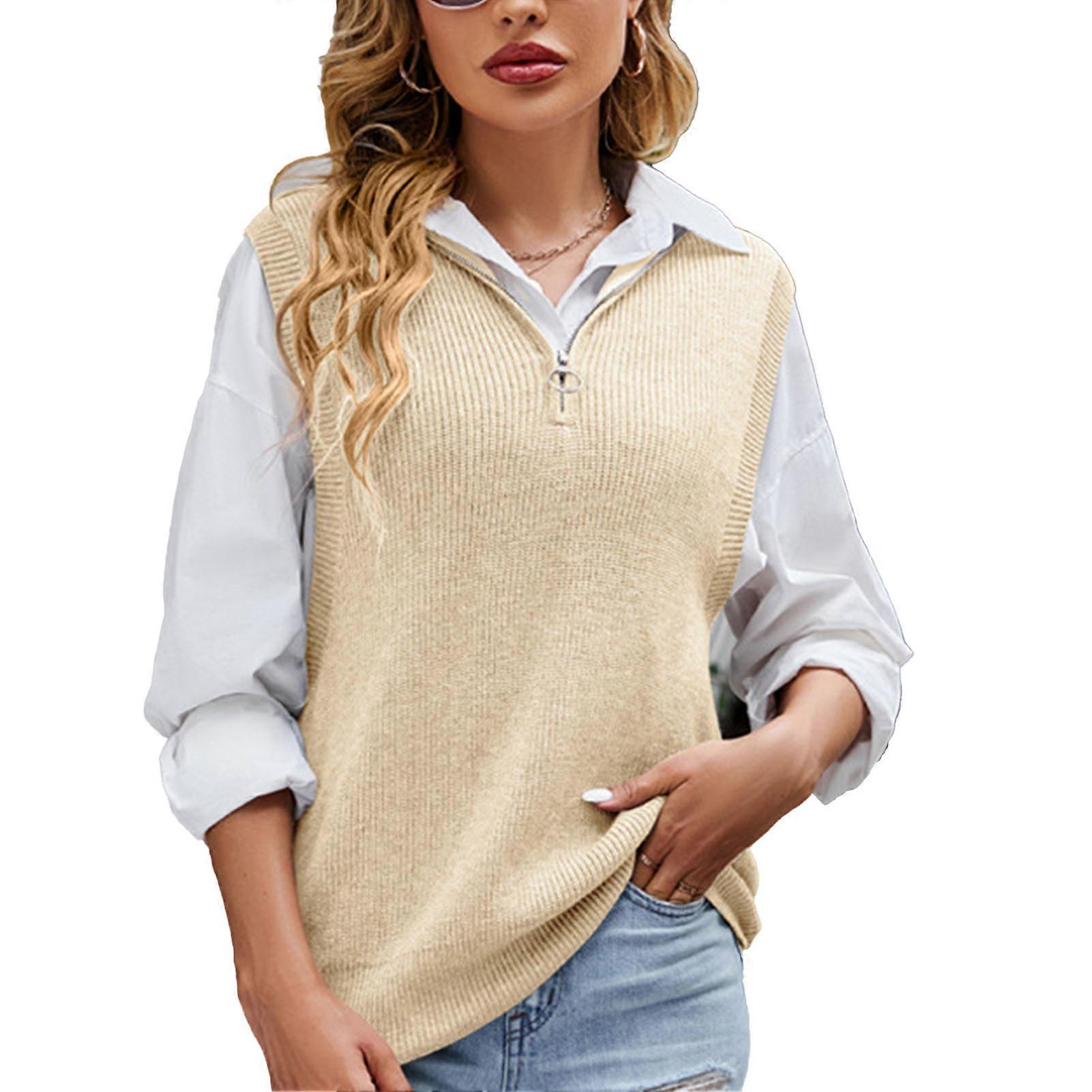 Women Zipper Pullover Knit Vest Tank Top Sleeveless Sweater S Beige
