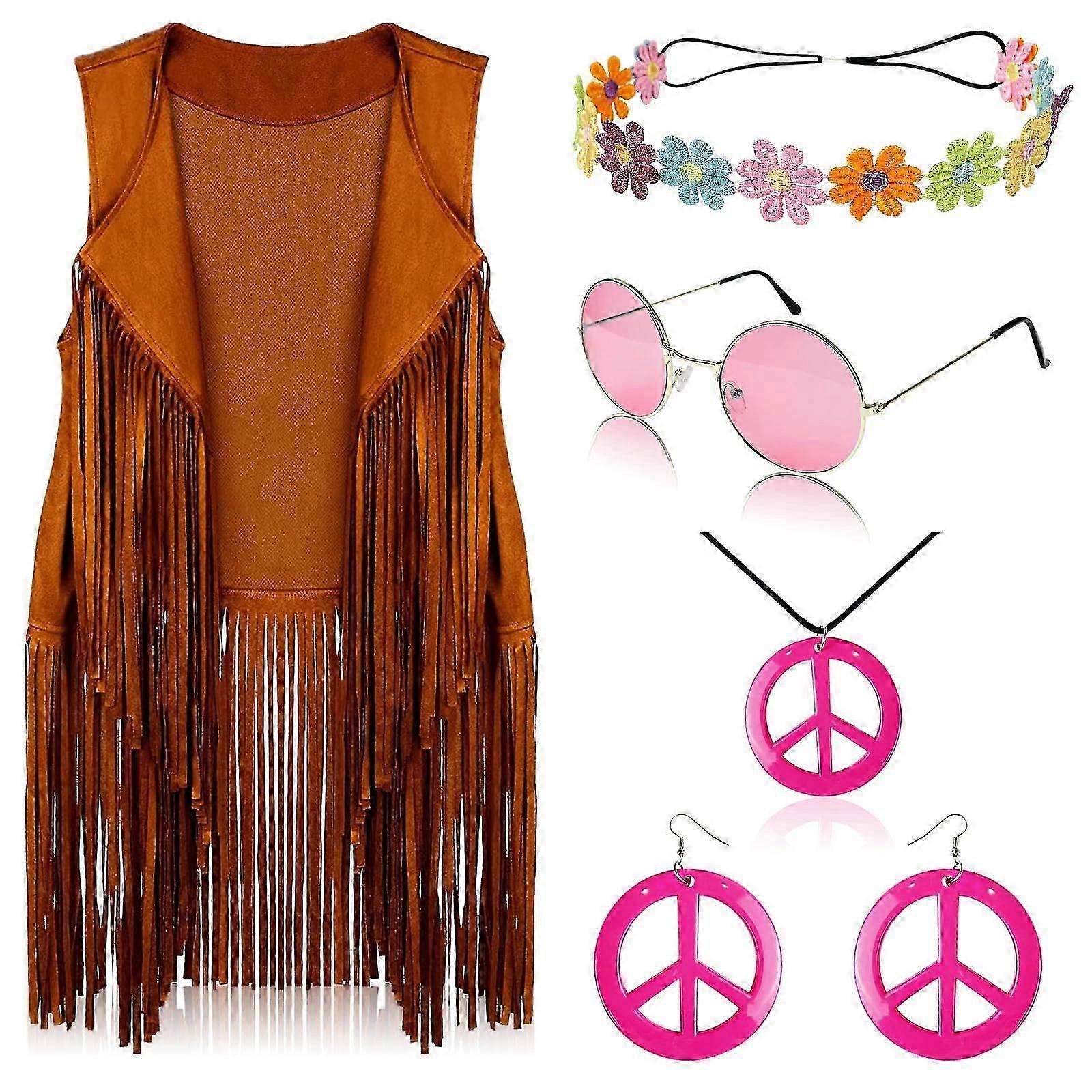 Peace Sign Earring Necklace Headband Fringe Vest Tassels Cardigan Hippie Costume for Women 60s 70s Hippie Clothes Set rose red1