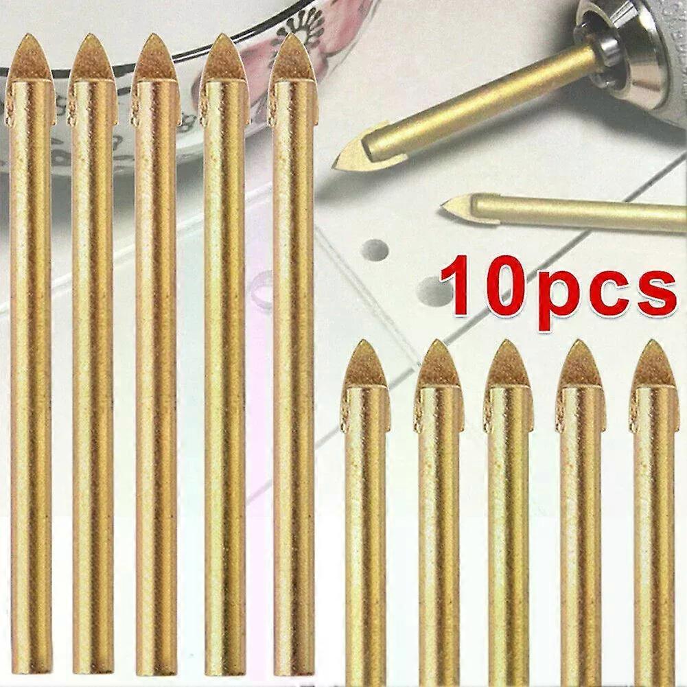 10pcs 6mm Tile Glass Cement Metal Ceramic Wood Plastic Hole Saw Drill Bit Carbide Spear Head Electric Tool Features: * new and high quality. *Ideal for drilling holes in bathroom tiles, or wall mirrors. *Strong toughness and wear resistance, can be installed in the hand drill, electric drill. *No chattering, novice easy to locate. *Small cutting resistance, improve the trepanning speed *Decorative, chip easily be clean. *Provide smooth, accurate drilling in ceramic tile, marble, china, mirrors and glass. *High quality carbide with a reinforced head that prevents bit cracking and provides a longer life. Specifications: *Type: Tile & Glass Drill Bit *Material: Carbide *Color: gold *Length: approx. 72mm *Shank: approx. 4.5mm. *Size of blade: 6mm x 1.5mm *Quantity: 10pcs/set Package Contents: 10x Drill bits Note: 1. The real color of the item may be slightly different from the pictures shown on website caused by many factors such as brightness of your monitor and light brightness. 2. Please allow slight manual measurement deviation for the data. _x000D_