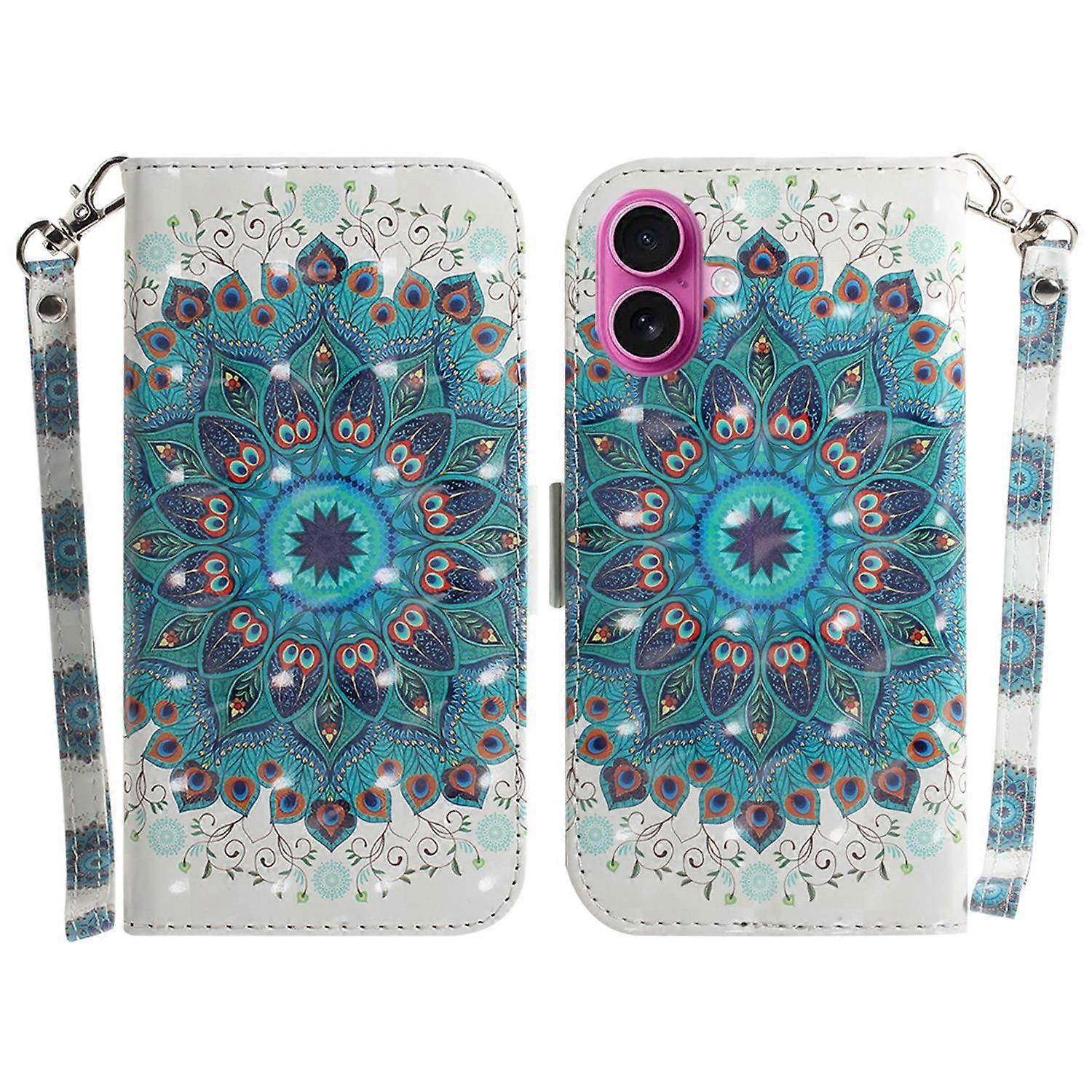 For iPhone 17 Case Pattern Printing Leather Wallet Phone Cover with Wrist Strap - Peacock Wreath