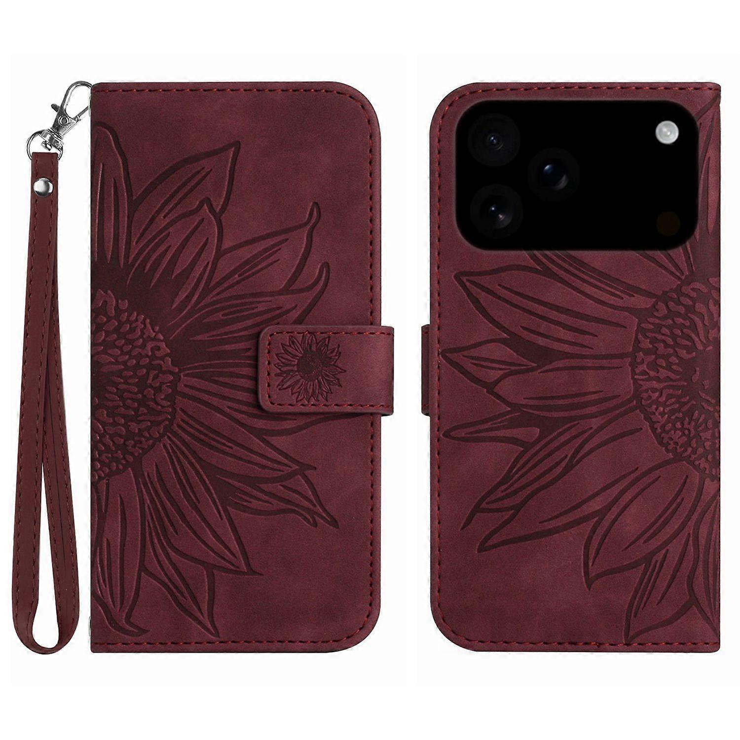 For iPhone 17 Pro Case Sunflower Imprint Leather Wallet Phone Cover with Wrist Strap - Wine Red