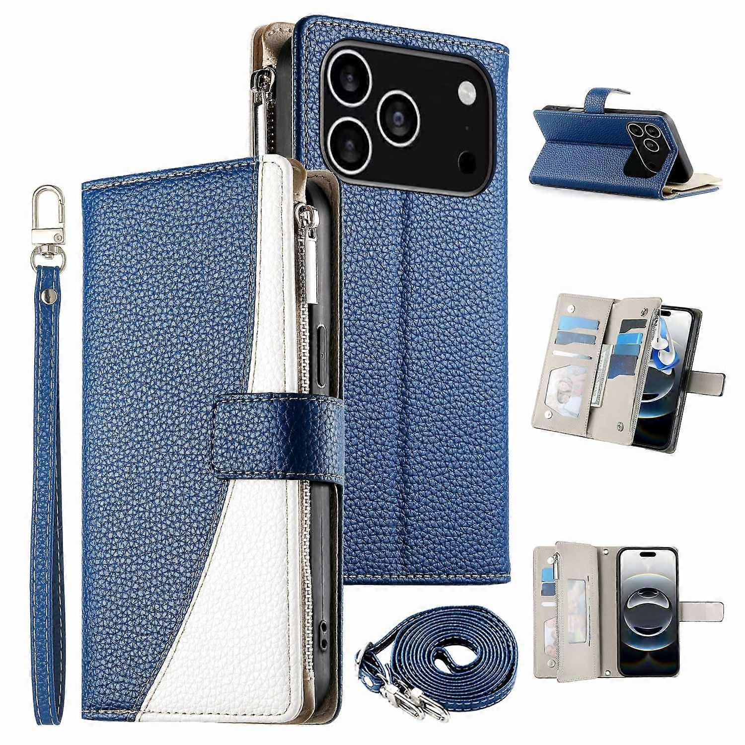 For iPhone 17 Pro Case Zipper Wallet Color Splicing Leather Flip Phone Cover with Straps - Dark Blue