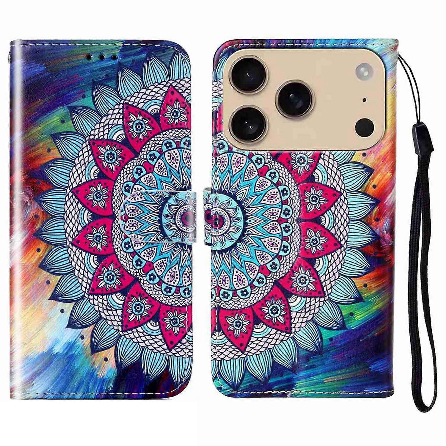 For iPhone 17 Pro Max Case Pattern Leather Wallet Phone Cover with Strap - Mandala Flower