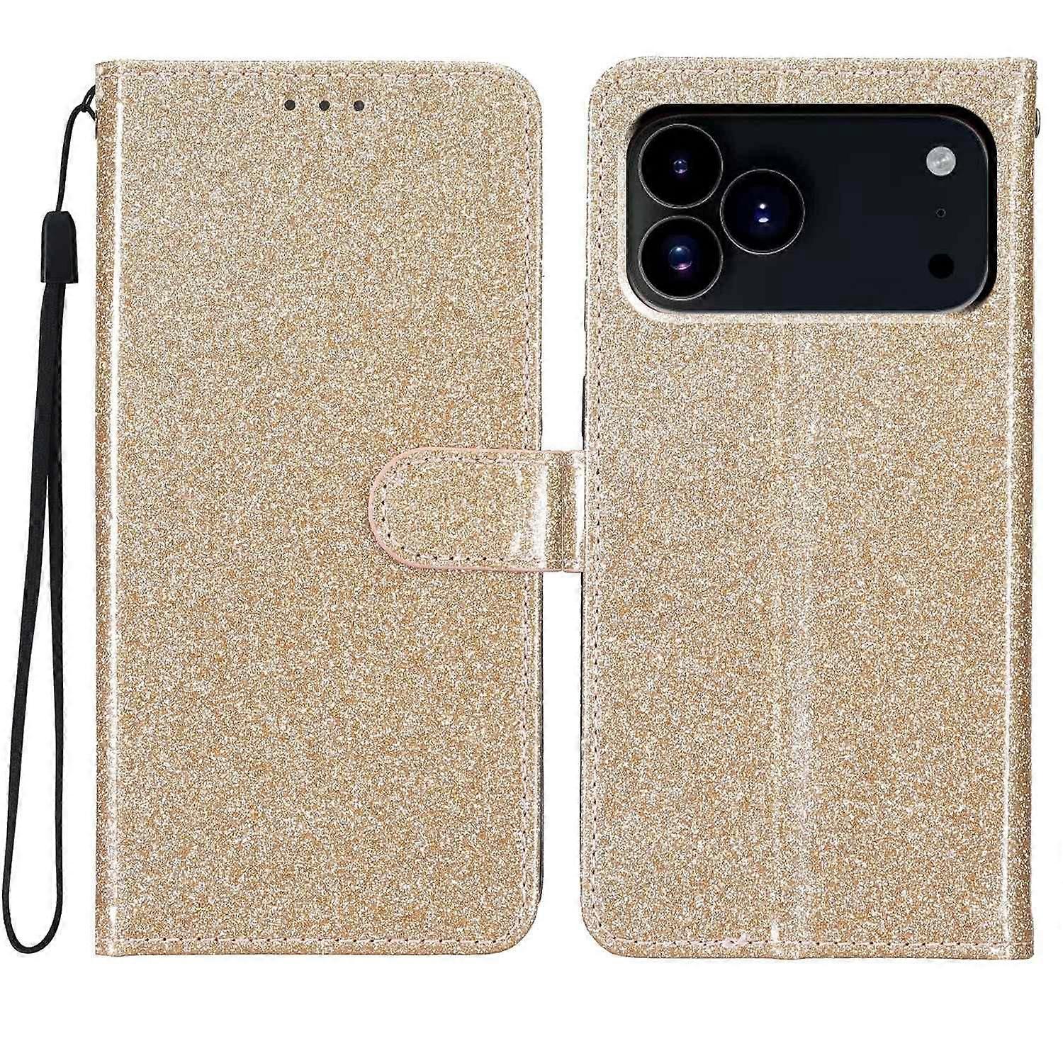For iPhone 17 Pro Wallet Case Glitter Anti-Scratch Leather Stand Phone Cover with Strap - Gold
