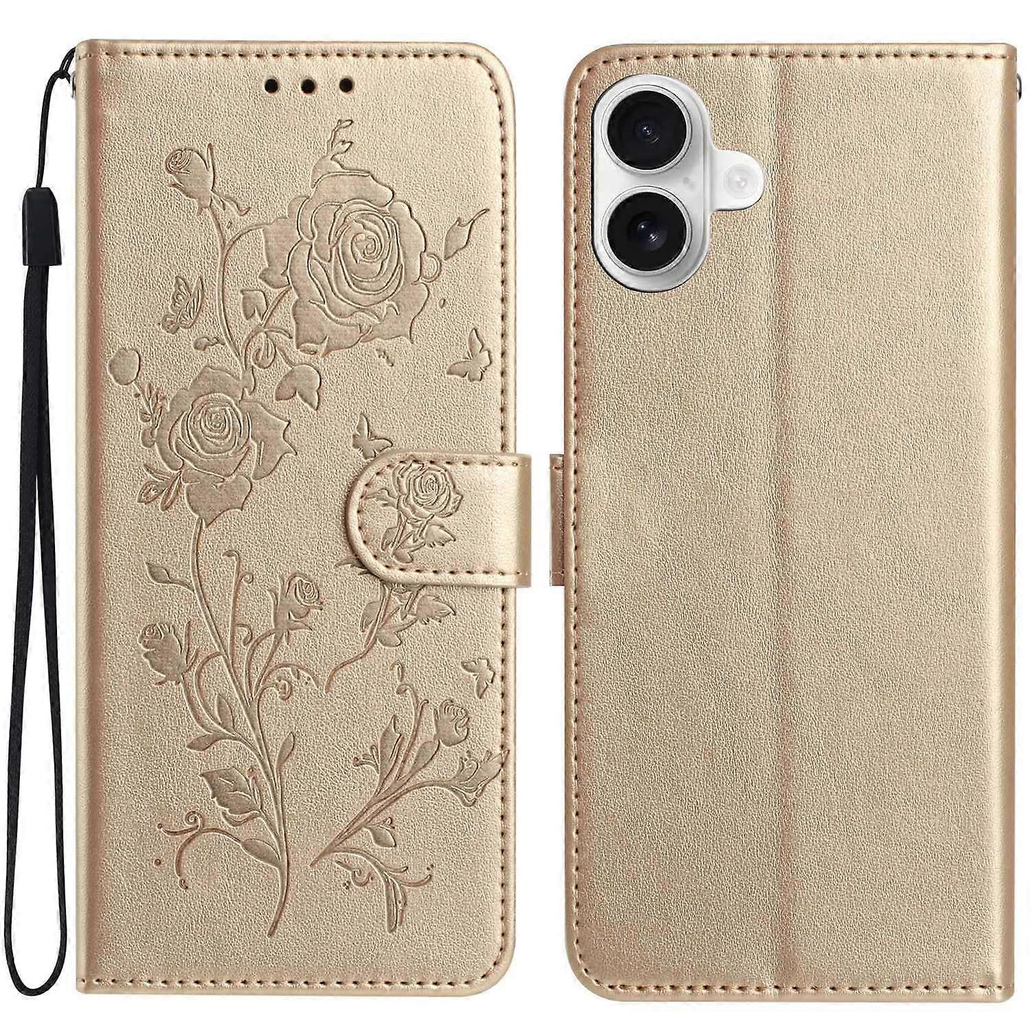 For iPhone 17 Wallet Case Rose Pattern Imprinted Leather Flip Stand Phone Cover with Strap - Gold