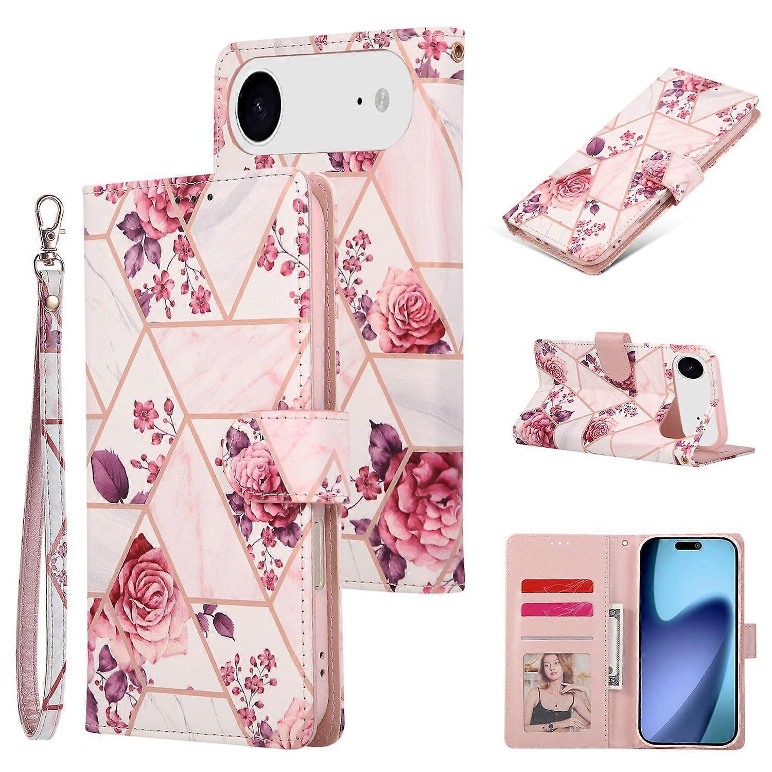 For iPhone 17 Air Case Lacquered Marble Pattern Leather Phone Cover with Wrist Strap - Rose Gold
