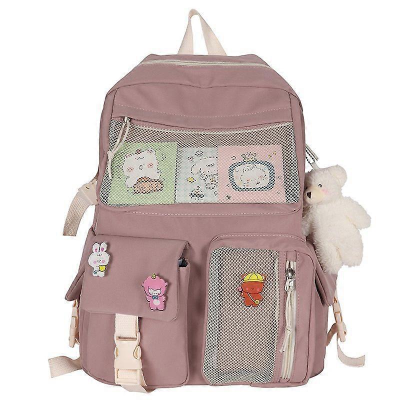 Kawaii Backpack with Bear Pin Accessories – Girls College High School Laptop Bookbag, Pink and Beige