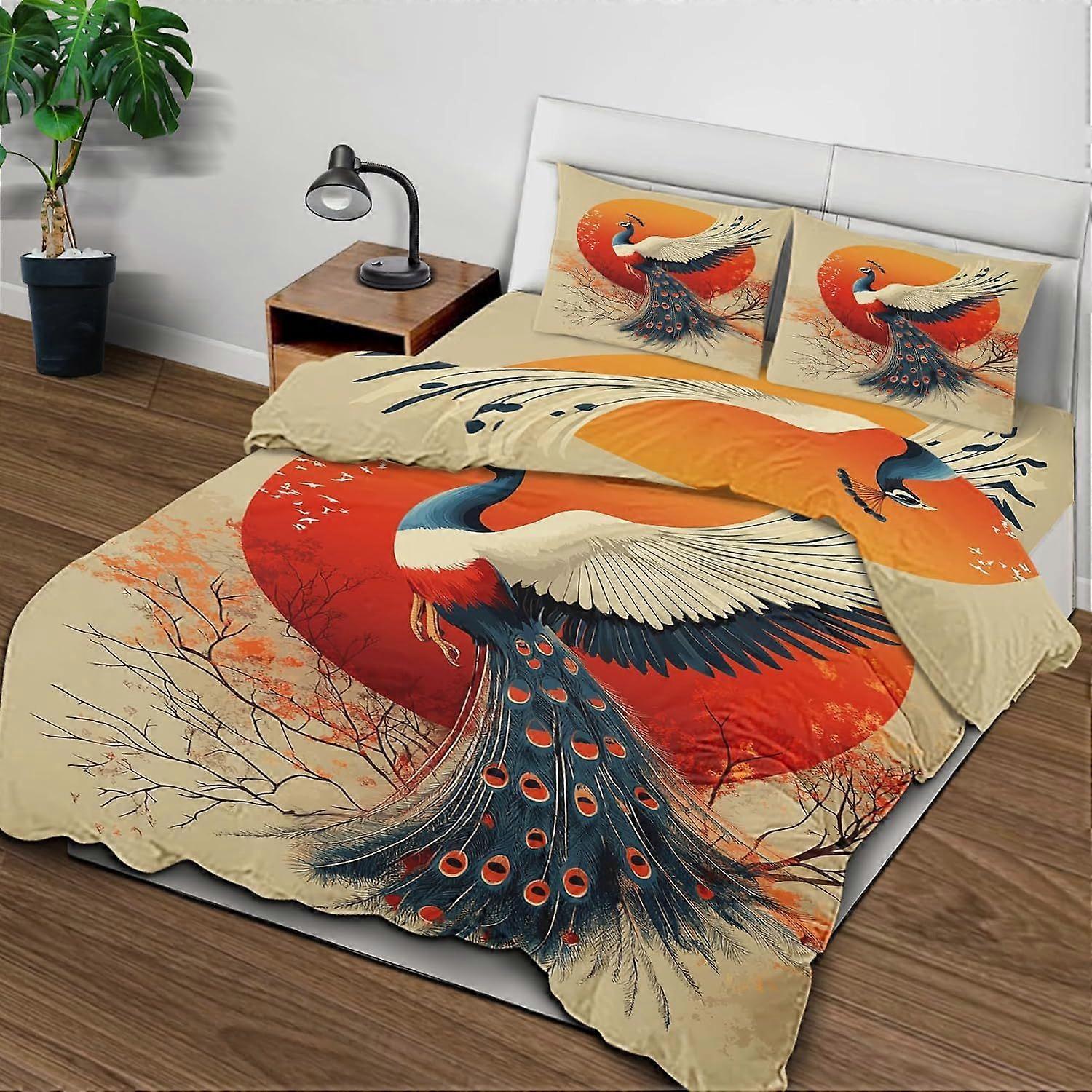 Peacock Duvet Cover King Size with Fitted Sheet - Lotus Flower Comforter Cover Set Bedding 4 Piece - Chinoiserie Flower Bedding Set with Zipper Closur