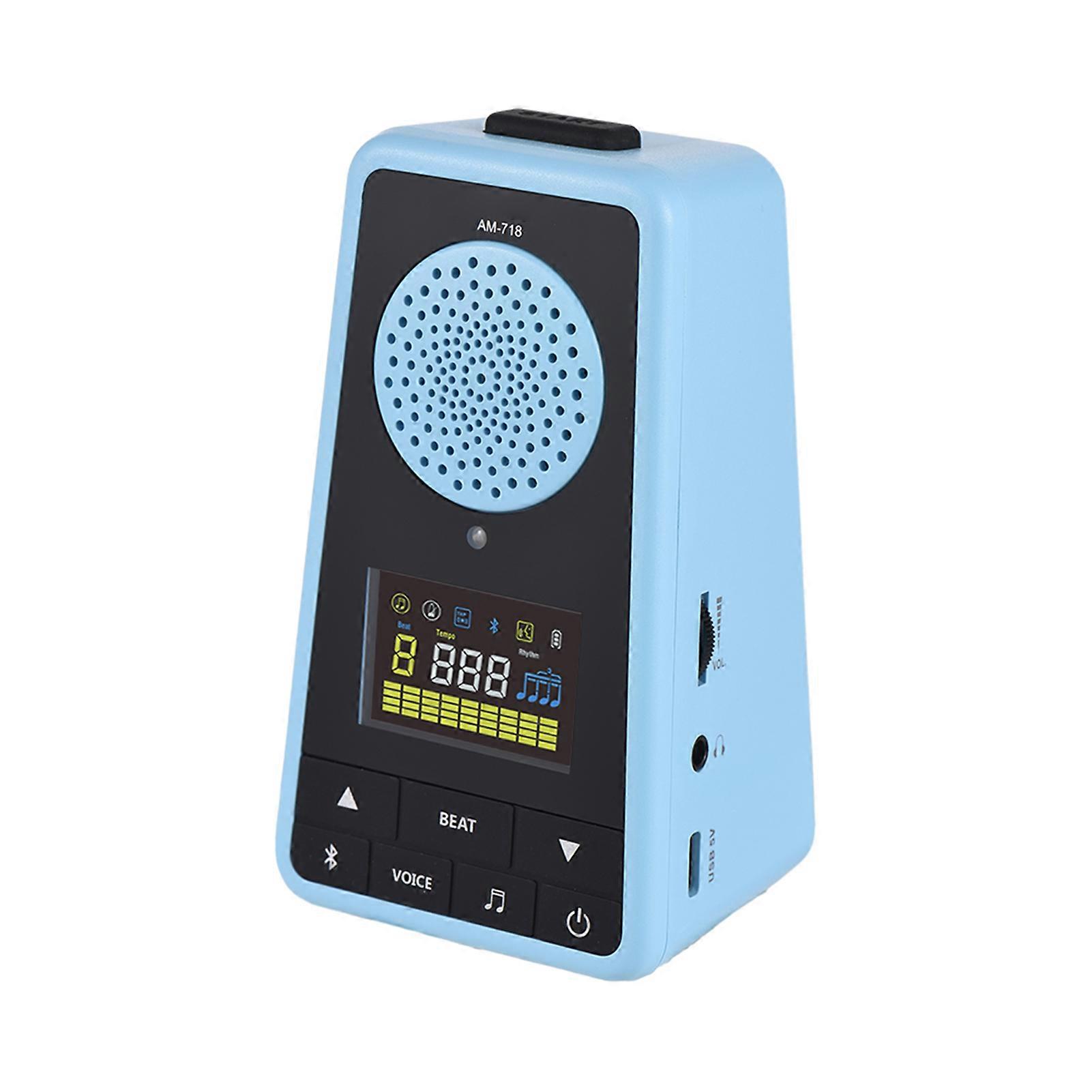 AROMA 2-in-1 Metronome BT Speaker for Guitar Piano Drum Violin Rechargeable Digital Metronome with Vocal Counts 1300mAh Large-capacity Battery VA Color Screen Portable Wireless Speaker Metronome Features: 【2-in-1 Metronome and BT Speaker】: This metronome combines the functionality of a metronome and a BT speaker, making it a versatile tool for musicians. It's suitable for a variety of instruments including acoustic/classical/electric guitar, bass, violin, ukulele, piano, electronic drum, and guzheng. 【Long Battery Life】: Powered by a 1300mAh lithium battery, this device can last up to 10 hours on a single charge. This ensures you can enjoy uninterrupted music practice or performance. The device charges via a Type-C interface and takes about 2 hours to fully charge. 【Clear Voice Beat Counting】: The digital metronome features clear, real human voice beat counting in both English and Chinese. The volume is adjustable, allowing you to set it to a level that suits your needs. 【Large VA Color Screen】: The large VA color screen provides a clear and easy-to-read display, enhancing your user experience. 【High-Quality Sound and Connectivity】: Electronic metronome with a 1.4-inch speaker size, 4 ohm speaker impedance, and 5W power, this device delivers high-quality sound. It features BT 5.0 for a stable connection up to 10m/33ft.  Specifications: Brand: AROMA Color: Black, Pink, Blue, White (optional) Metronome Timbre: 3 types Tempo Range: 30bpm-260bpm Beat: 0, 1, 2, 3, 4, 5, 6, 7, 8, 9 Voice Beat: Chinese, English BT Version: 5.0 Screen: Color screen Connection Distance: 10m/33ft Speaker Size: 1.4inch Horn Impedance: 4 ohms Power: 5W Power Supply: 3.7V/13000mA rechargeable polymer lithium battery Charging Time: About 2 hours Battery Life: About 8 hours Charging Interface: Type-C Product Size: 11.9 * 6.6 * 5.9cm/4.7 * 2.6 * 2.3inch Item Weight: 160g/5.6oz Note: Due to the different display screen and light effect, the actual color of the item might be slightly different from the color showed on the pictures. Packing List: 1 x Metronome 1 x Charging Cable