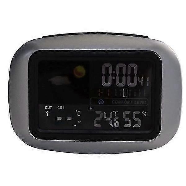 Dimensions: 9 x 1 x 7.2 inches; requires 2 AA batteries (not included).Weather Station with Easy-to-Read DisplayFeatures a clear display with icons that change based on the recorded temperature.Compact size and excellent visibility make it ideal for creating a perfect living environment.Features:Wireless outdoor sensorIndoor and outdoor thermometerComfort level indicationWeather forecast via iconsCalendarClockAlarmSnooze functionBacklightAtomic clock with self-adjusting time and date.Note: Displays INDOOR temperature ONLY, not outdoor temperature.Automatically updates for seasonal time changes where applicable.Displays time, date, day, and temperature on one screen.Can be wall-mounted or freestanding.