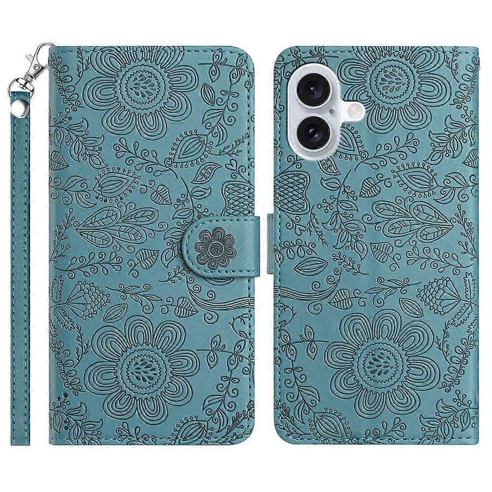 For iPhone 17 Case Flower Imprint Leather Flip Wallet Phone Cover with Wrist Strap - Blackish Green