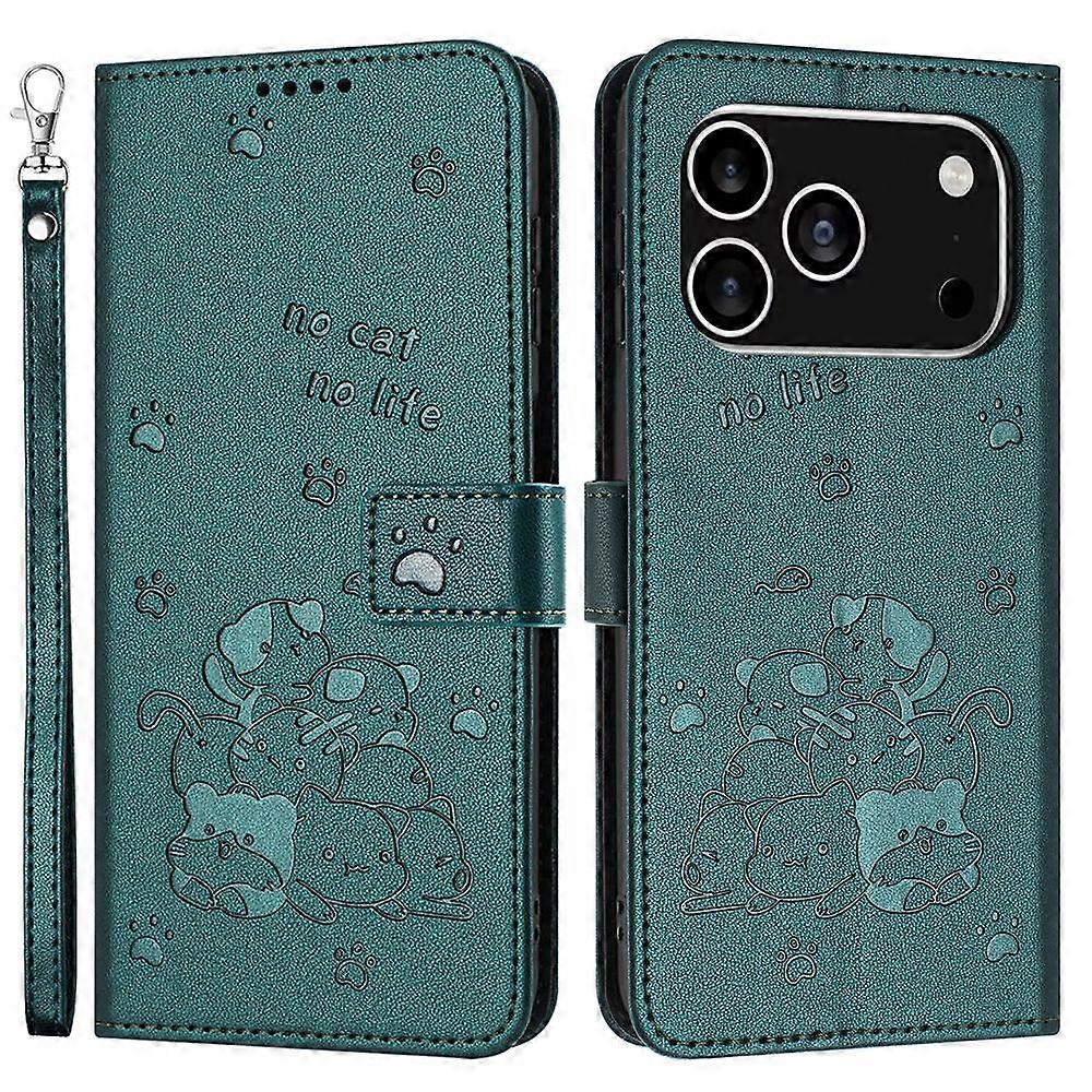 For iPhone 17 Pro Wallet Case Cats Imprint Leather Phone Cover with Strap - Blackish Green