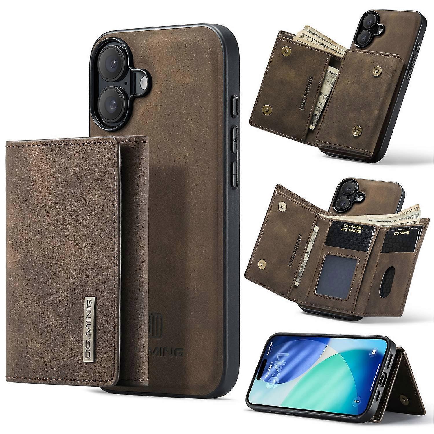 DG.MING M1 Series for iPhone 17 Case Kickstand PU Phone Cover with Detachable Wallet - Coffee