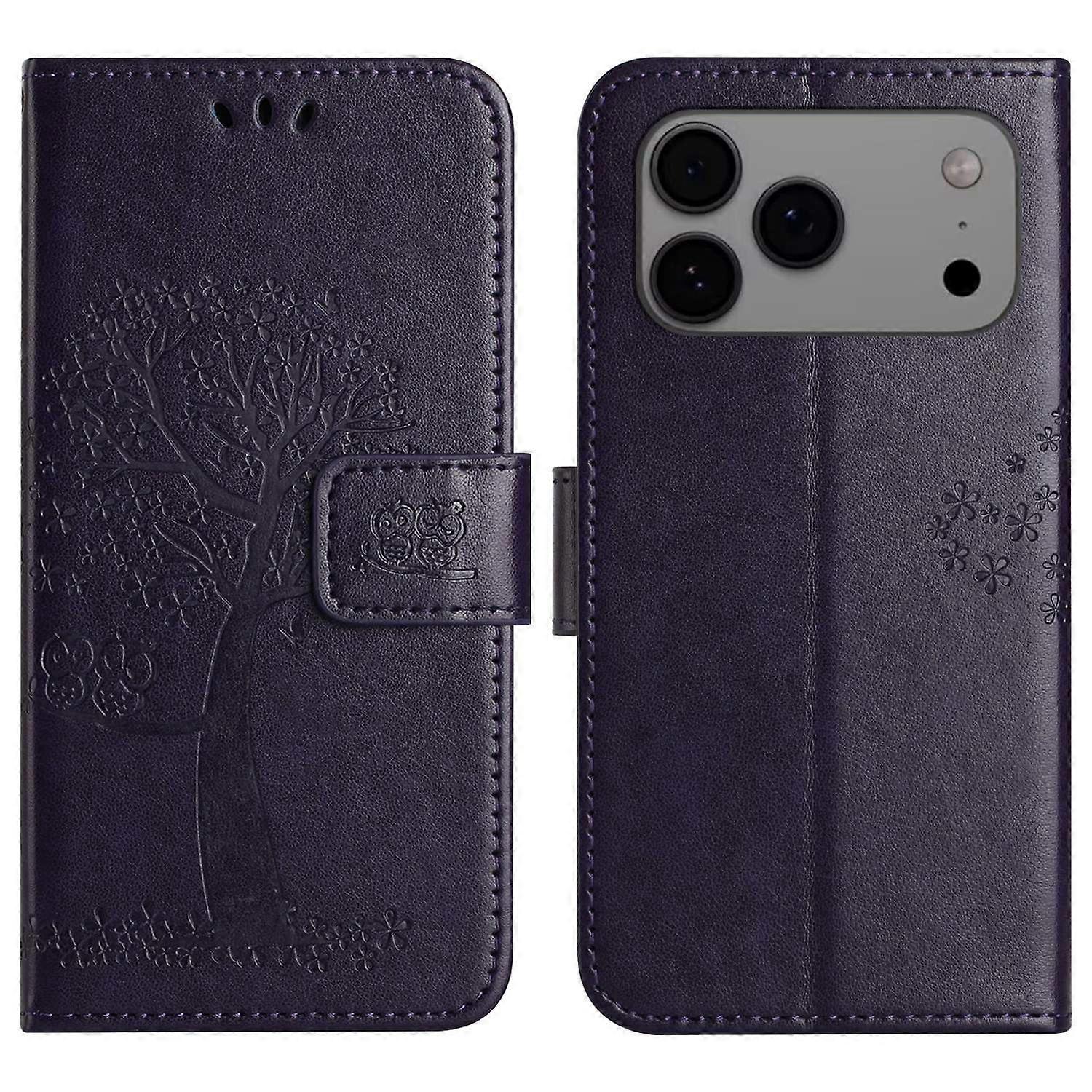 For iPhone 17 Pro Case PU Leather Owl Tree Imprinted Wallet Phone Cover with Strap - Dark Blue