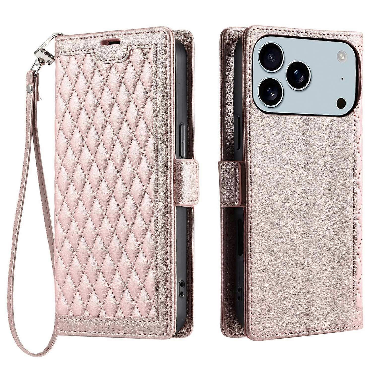 For iPhone 17 Pro Max Leather Case Rhombus Texture Wallet Stand Phone Cover with Wrist Strap - Rose