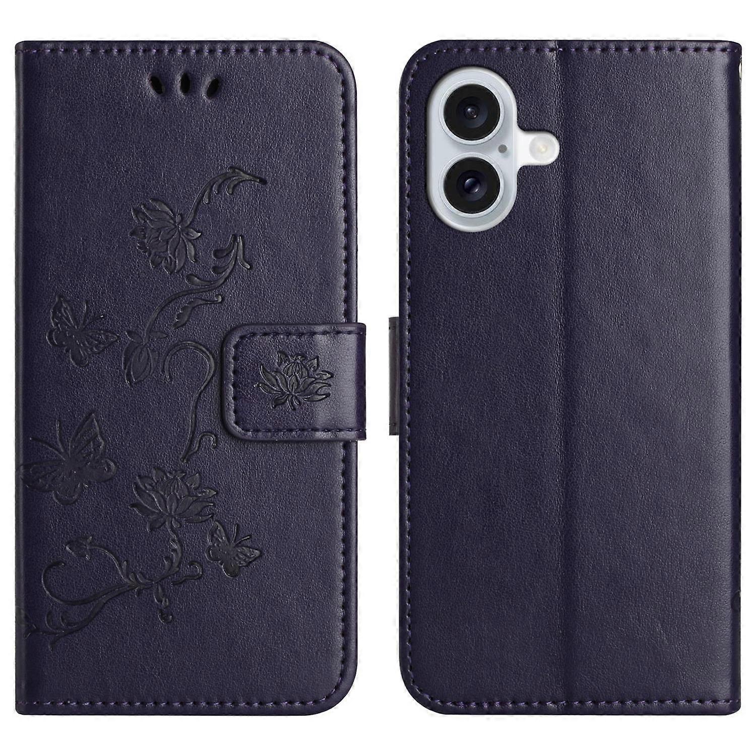 For iPhone 17 Case Wallet Stand Imprinted Butterfly Flower PU Leather Phone Cover - Dark Blue