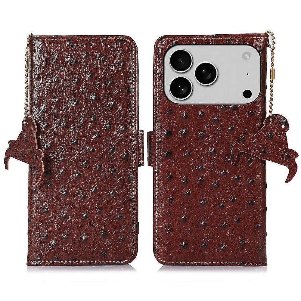 For iPhone 17 Pro Case RFID Blocking Genuine Cow Leather Phone Case Ostrich Texture - Coffee