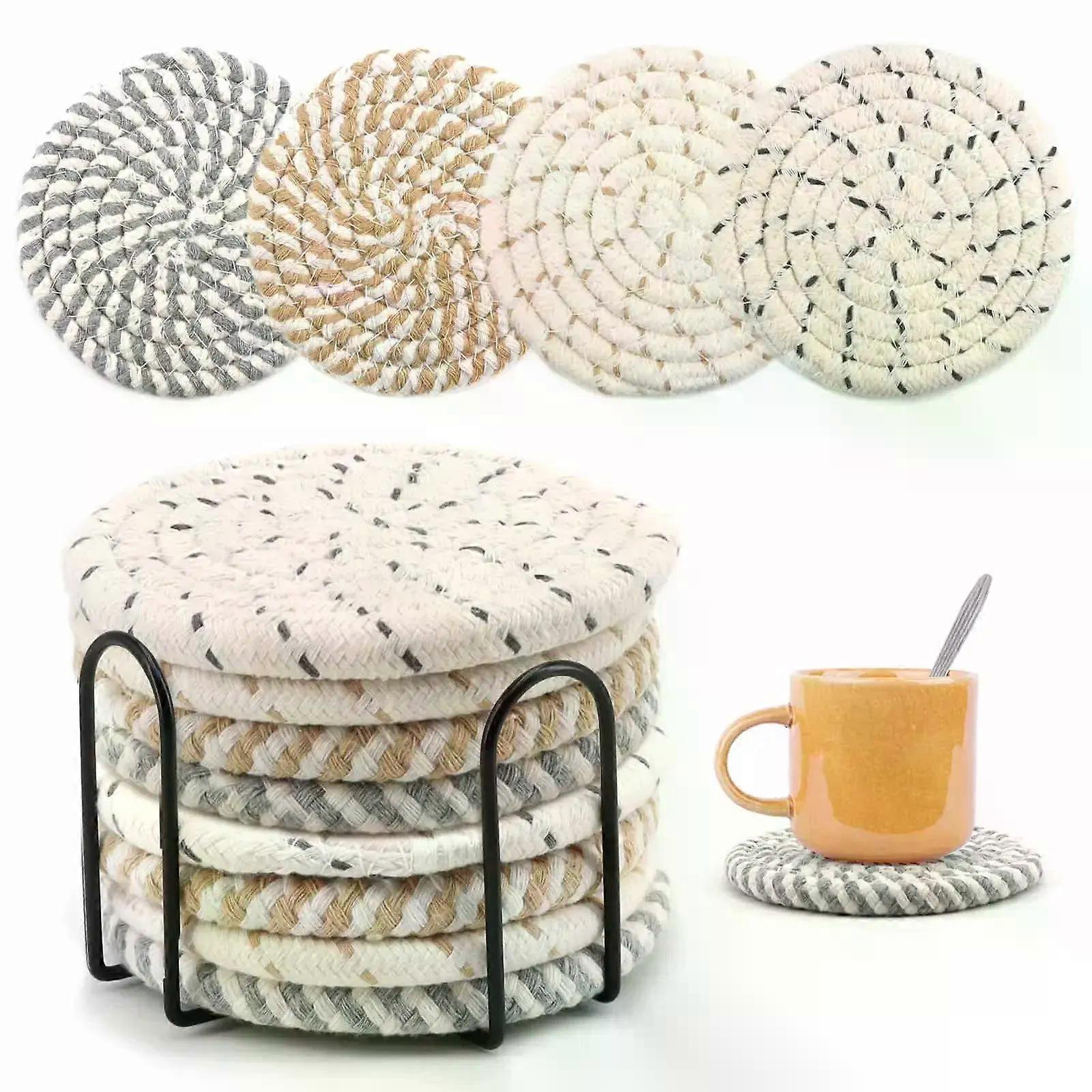 8Pcs Cup Coasters for Drinks Absorbent Woven Coaster Set with Holder Farmhouse Cloth Fabric Cup Coasters for Coffee Tea 8 Piece Cup Coaster for Drink Absorption Woven Coaster Set with Stand Features: 1. Super absorbent: Beverage coasters are handmade from 100% cotton and linen, which is thicker (8mm), larger and more absorbent than silicone or ceramic beverage coasters. 2. Protect your furniture: This absorbent coaster is very soft, no need to worry about them scratching the furniture, effective thermal insulation, so when you enjoy a hot drink, it won't leave any marks on the table. 3. Easy to clean and store: These cute coasters are more convenient to clean than cork coasters, just rinse with water and hang them to dry. When not in use, you can put them directly into the coaster holder, which will make your home tidier. 4. Awesome Gift: This coaster set is the perfect gift for friends and family on a housewarming, birthday, Mother's or Father's Day, wedding anniversary, Thanksgiving, or Christmas, and is a great gift for any respectable family member or friend. Detail: Material: environmentally friendly polyester cotton Color: Solid Package Includes: 1 set of coasters (8 coasters + 1 holder) _x000D_