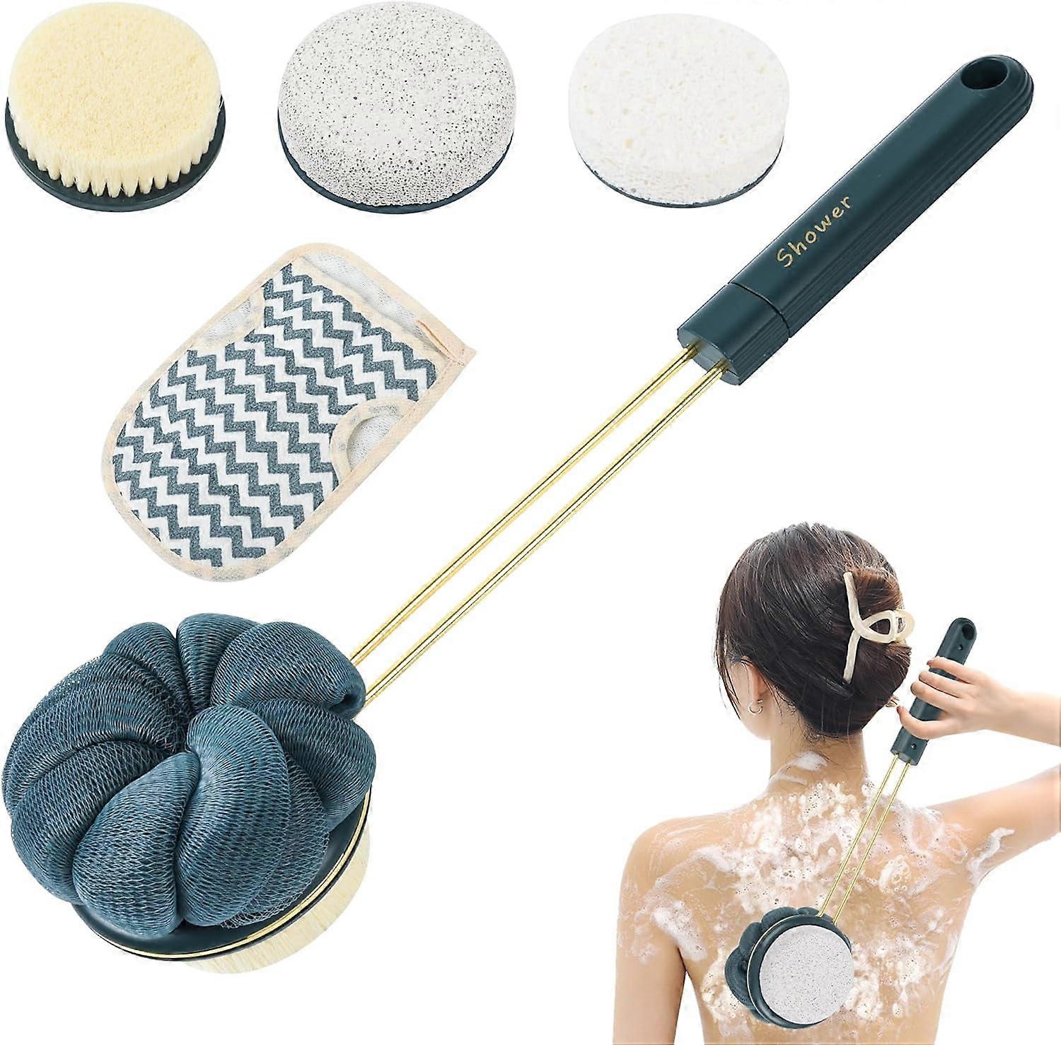 Premium Bath Brush - Double-Sided Shower Ball, Pumice & Sponge Heads for Full-Body Cleanse | Extra Long Handle (Blue)