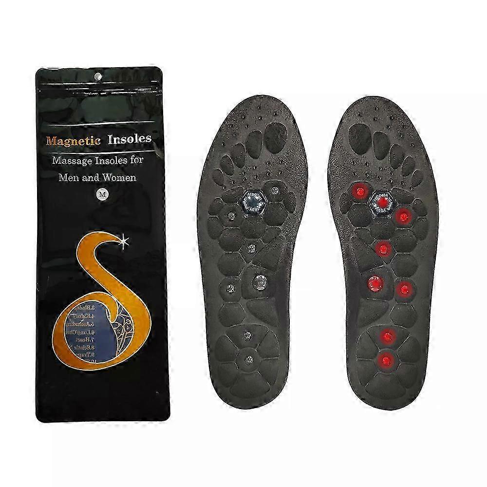 Product Name: Magnetic Acupressure Insoles. Color: Black. Material: Weak Magnetic Magnet + EVA. Size:S(35~39)/25.5cm. M(40~43)/27.5cm. L(44~47)/30.5cm. Packing List: 1 Pair * Acupressure Foot Insoles.