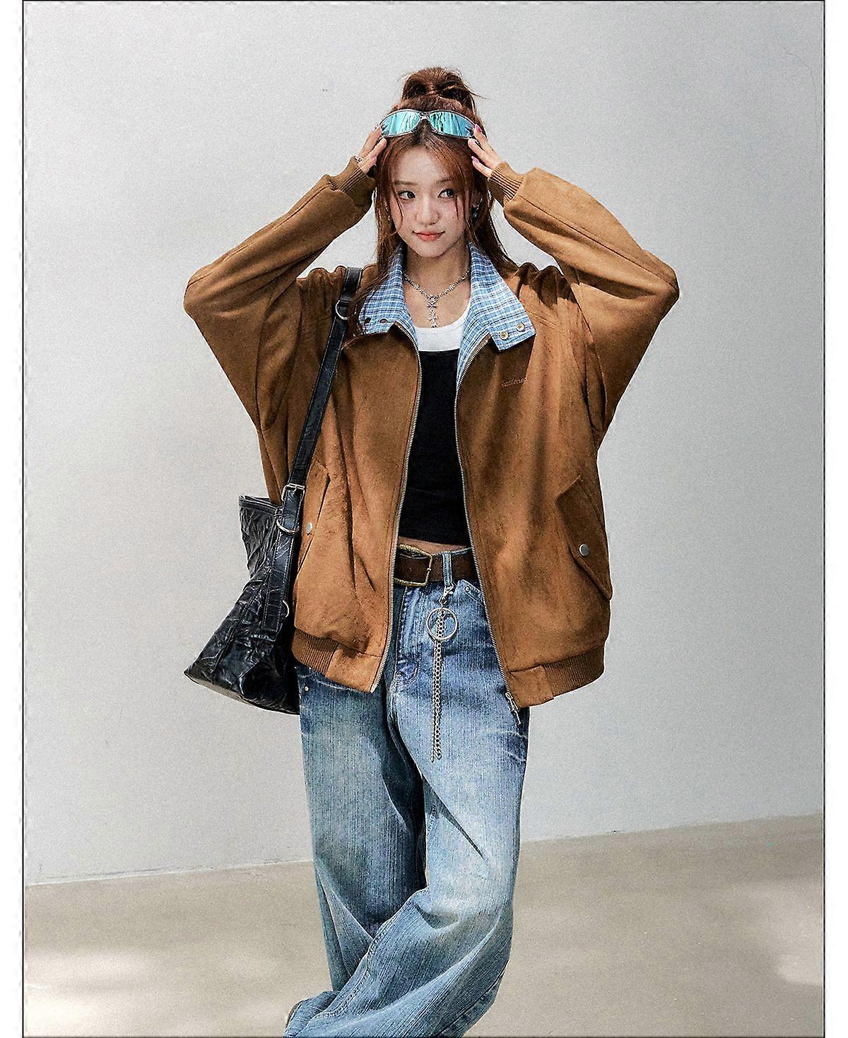 Retro American Style Baseball Uniform Jacket Women's Autumn High-Grade Plaid Stitching Zip Long Sleeve Coat Loose Top Fashion