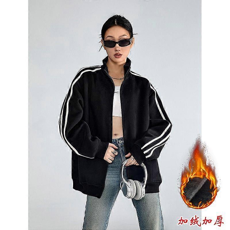 Black Autumn And Winter Three-Bar Hoodie Jacket For Women, Spring And Autumn American Laid-Back Outfit, Early Autumn Baseball Jacket Top, Winter Fleec