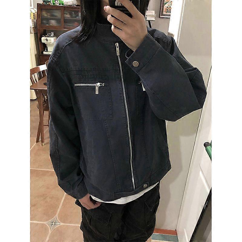 Vintage Washed Canvas Denim Jacket For Men, American Multi-Pocket Stand-Up Collar Harrington Work Jacket