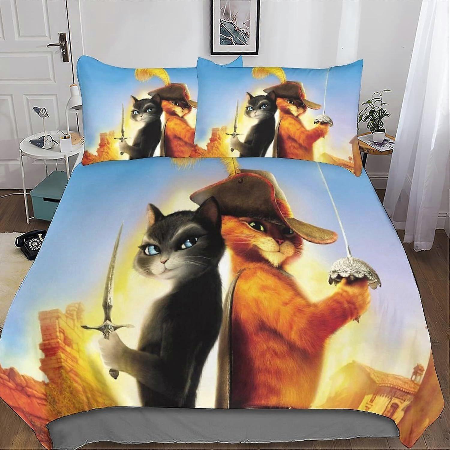 PIN431 Puss in Boots Cartoon Anime Bed Cute Cat Set Bedding Set with 3 Piece Soft Comforter Cover,100% Snug Bedspreads Double200x200cm