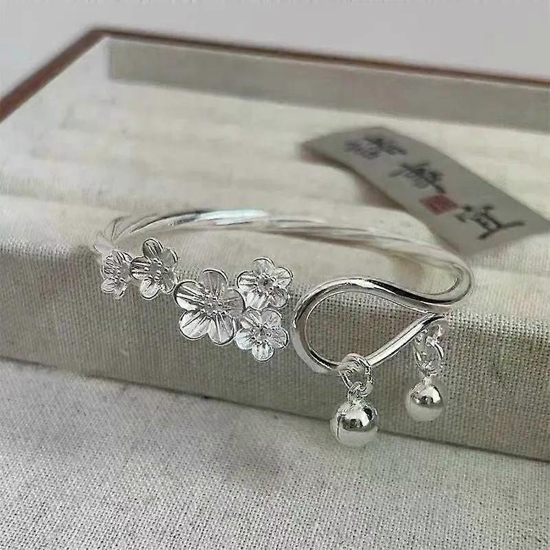 New 1Pc Plum Blossom Bell Bracelet Chinese Style Retro Silver Color Cuff Bracelets For Women Flower Open Bangle Bracelet Jewelry