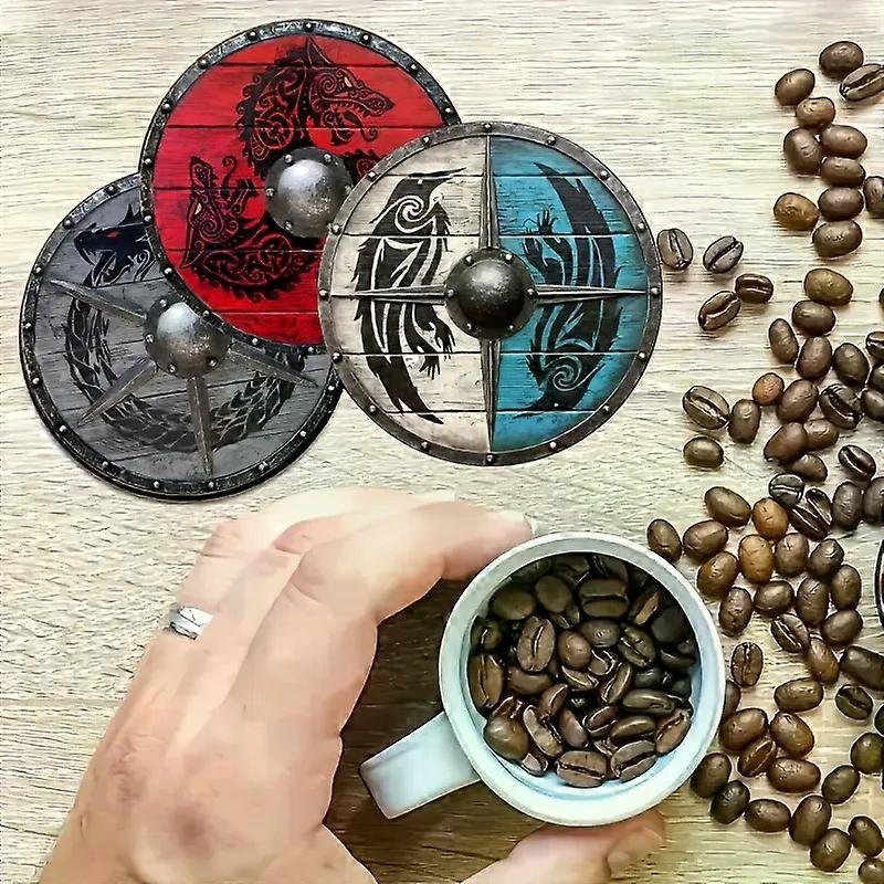 6 Pieces 2D Wooden Coasters Viking Warrior Shield Pattern Theme Desktop Heat Mats Home Decor Coffee Mug Coasters For Office