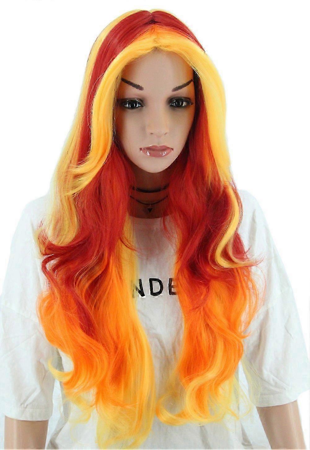 Womens Long Wave Devil Fire Wig Ombre Colorful Halloween Costume Cosplay Party Wig Red Orange Yellow