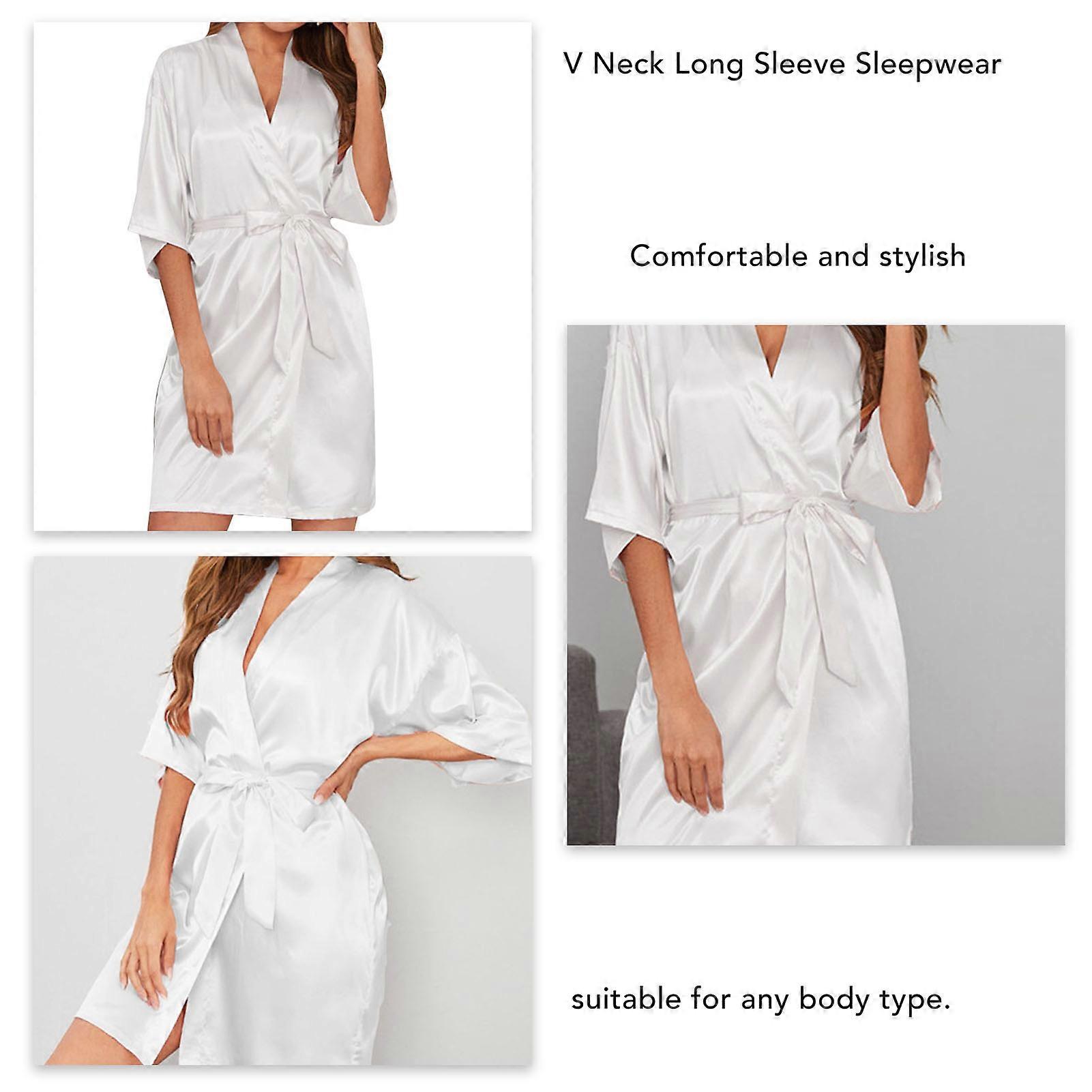 Women Belted Pajama Robe V Neck White S M L Long Sleeve Sleepwear