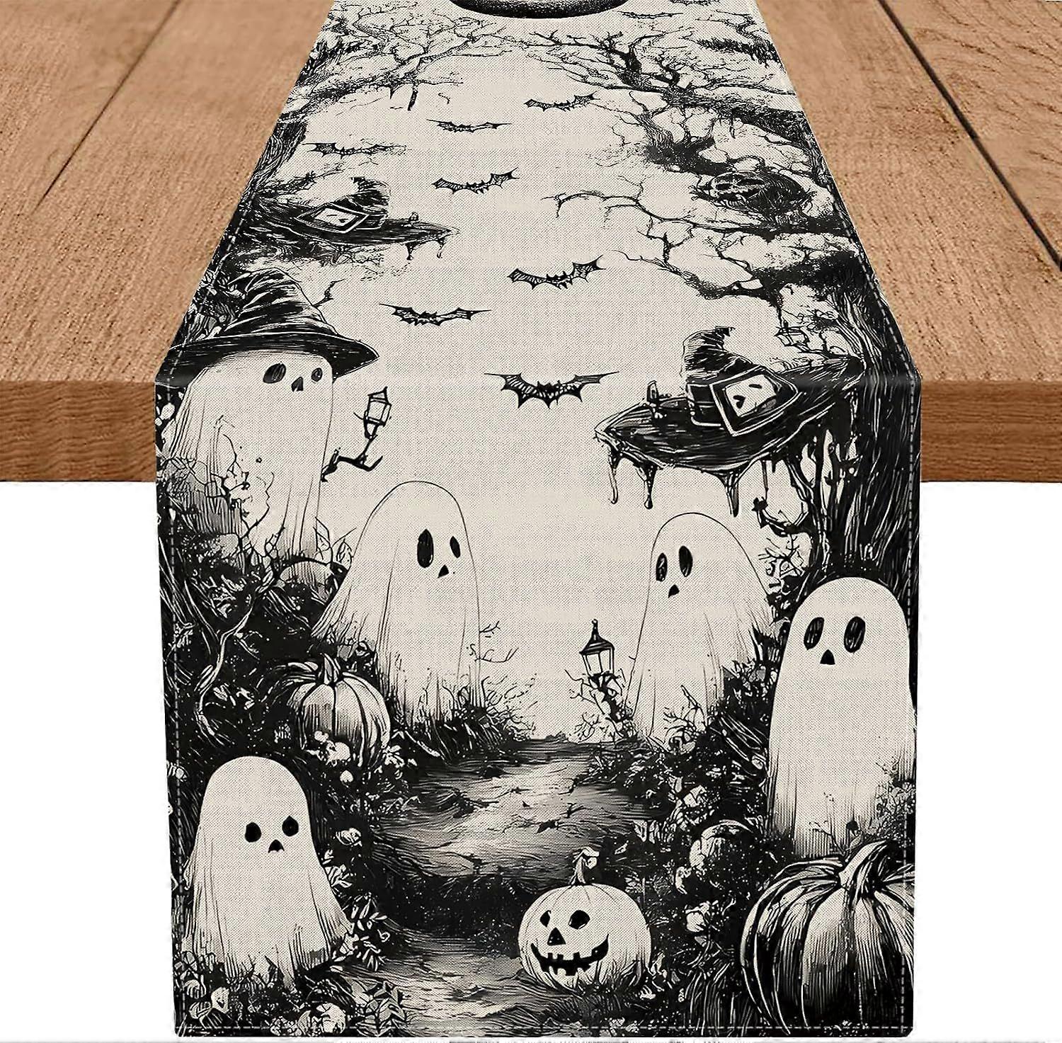 Halloween Table Runner Black Ghost Holiday Burlap Table Decoration Indoor Outdoor Home Decor Party Supply 13 x 72 Inch