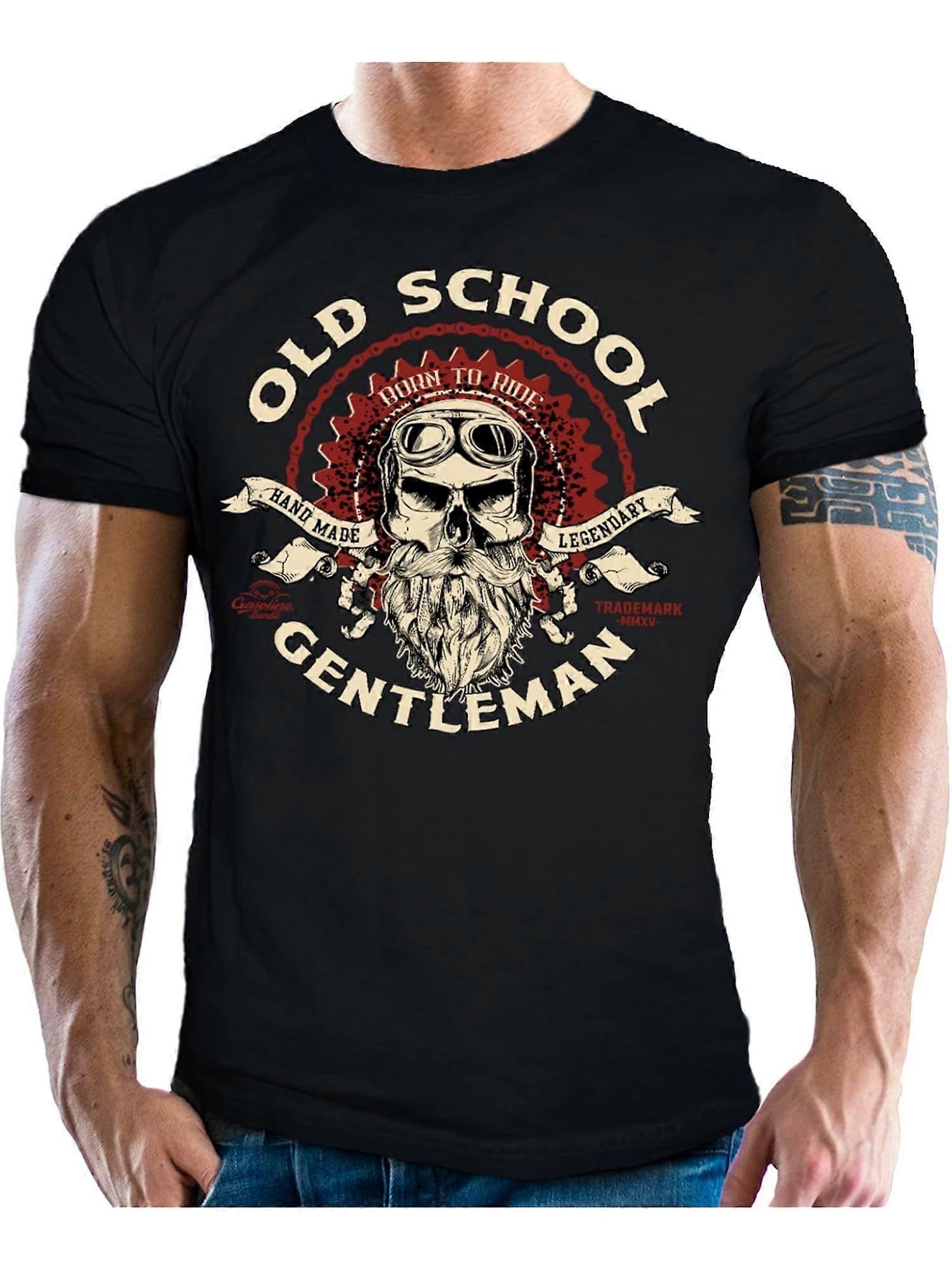 Gasoline Bandit Biker Racer Men's Vintage Motorcycle T-Shirt - "Old School Gentleman" German Saying & Skull Goggles Graphic, Black-SQWER109